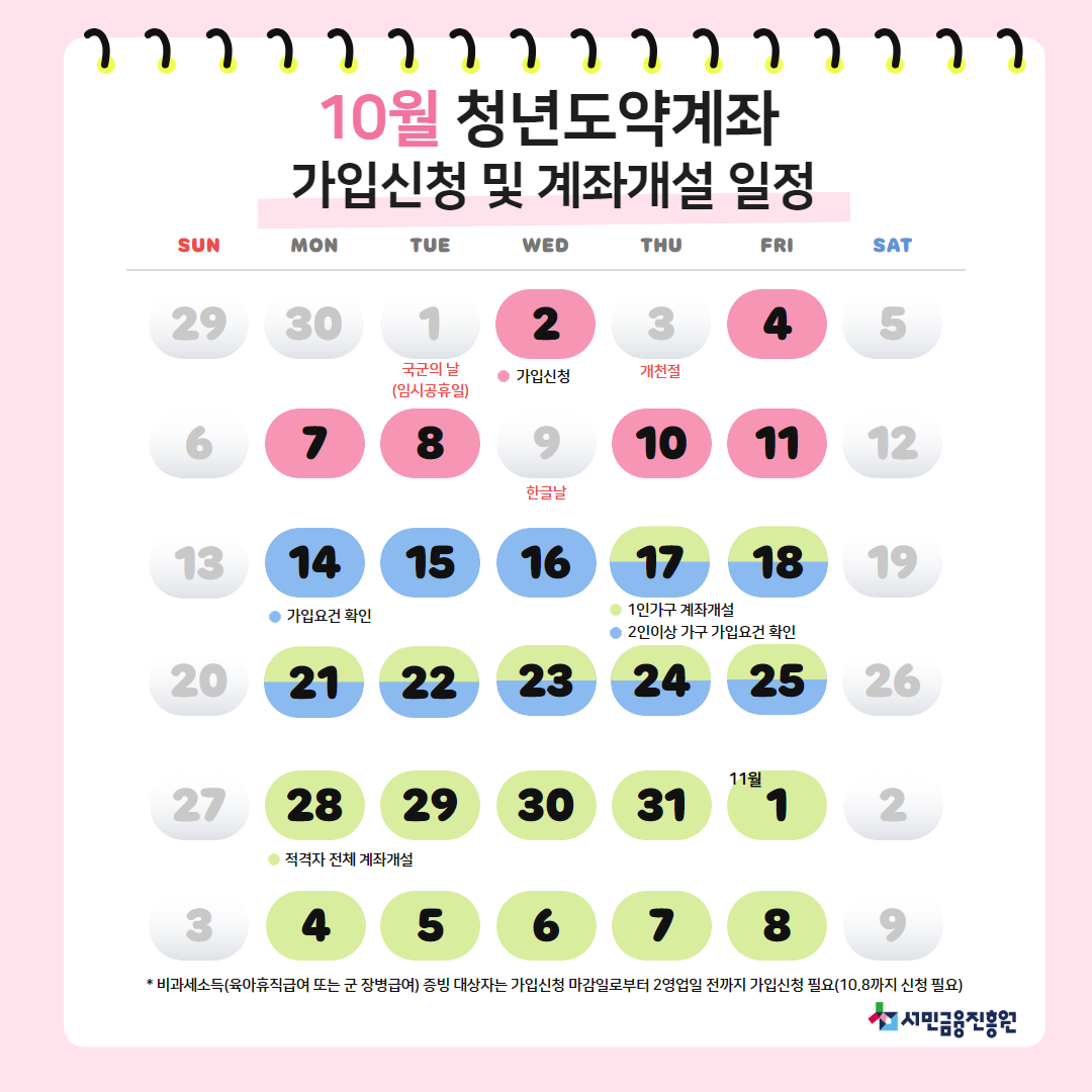 가입신청일 : 10.2(수) ~ 10.11(금) 계좌개설(영업일에만 운영) : 1인 가구 10.17(목) ~ 11.8(금) / 2인 이상 가구 10.28(월) ~ 11.8(금) ) 기존에는 9월 2일부터 13일까지 신청하고 가입 통지를 받은 청년들은 10월 4일(1인가구의 경우 9월 24일)부터 10월 18일(금)까지 서비스를 오픈할 수 있었다. 등록 및 심사 과정